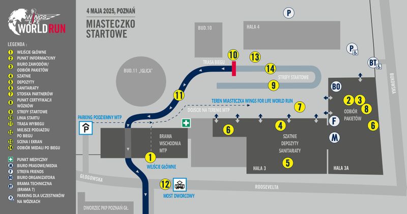 Miasteczko biegowe Wings for Life World Run zlokalizowane jest na terenie Międzynarodowych Targów Poznańskich. W celu dojazdu do Biura Zawodów, jak i na start biegu, rekomendujemy korzystanie z komunikacji miejskiej – teren imprezy znajduje się bezpośrednio przy dworcu PKP Poznań Główny (tramwaj - przystanek „Most Dworcowy”).